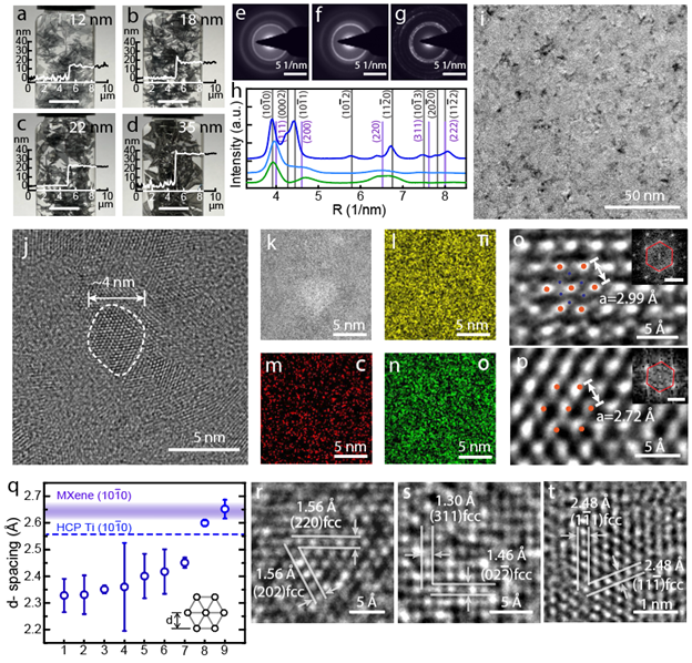 图1. a-d) 分散于水中的不同厚度二维钛。 e-g) 不同厚度二维钛的SAED 图像. h) 不同厚度二维钛的SAED图通过环向积分得到的信号强度曲线,绿色和紫色竖线分别标定了HCP Ti 与 FCC TiC 对应的峰位置。i) 18nm厚二维钛的TEM图与SAED图案。 j) 二维钛的HRTEM图。 k-n) HAADF-STEM 图与对应的元素mapping。o, p) HRTEM下二维钛的六角密排结构。q) 二维钛的晶面间距与 HCP Ti 以及 Tin+1CnTx MXene 比较。r-t) HRTEM 图像,二维钛中存在的FCC 晶格。