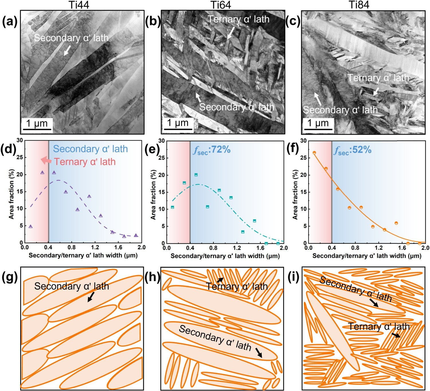 图3 (a−c)Ti44、Ti64和Ti84的明场TEM图像。(d−f)次生马氏体(secondary and ternary α′)板条宽度分布。(g−i) Ti44、Ti64和Ti84不同显微组织示意图。©2023 The Author(s)