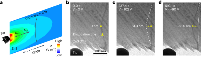 图1 由外电场驱动的位错运动;a, TEM实验装置示意图。电压V通过钨尖施加到ZnS样品上。ε是外加电场。εV+表示正电压下的电场;εV−表示负电压下的电场。b-d,明场TEM图像显示了施加可变电压时位错的位置。当电压从0增加到102 V (c)时,标记点(黄色圆圈)向右移动61.3 nm(远离尖端),当电压降低到-90 V (d)时,标记点向左移动13.5 nm(靠近尖端)。c和d中的虚线表示位错运动前的位置。黄色箭头表示位错的运动方向。©2023 Springer Nature