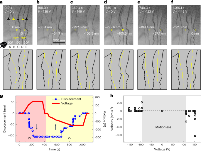 图2 30°和90°不全位错在电场作用下的迁移率;a-f,明场TEM图像和相应的原理图显示了实验过程中不全位错的位置:两个30°(B和D,用黄色虚线表示)和三个90°(A, C和E,用黑色实线表示)。黄色箭头表示位错B和D上的标记点在正电压(b,c)下向左移动,在负电压(e,f)下向右移动。在整个实验过程中,位错A、C、E保持在初始位置。g,位错D上标记点的外加电压和位移随时间的变化图。箭头表示在正电压(V+,红色区域)和负电压(V -,黄色区域)下位错运动的相反方向。h, a中两个标记点的测量速度随外加电压的函数。位错不动的电压范围用灰色表示。©2023 Springer Nature