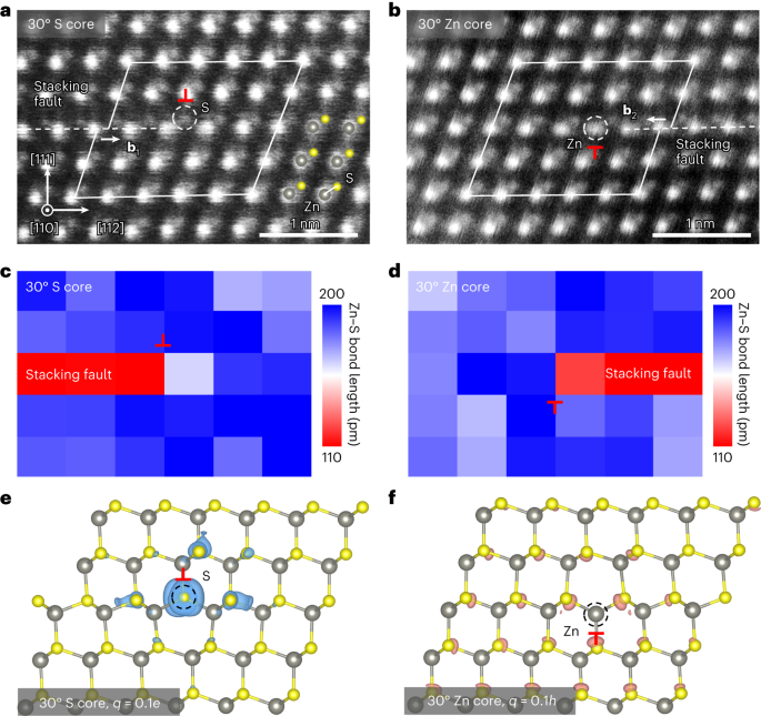 图3 ZnS中30°不全位错的原子结构和电荷分布;a,b,沿位错线方向观察的30°S (a)和30°Zn (b)位错芯原子分辨HAADF图像。a和b中的Burgers回路,投影的Burgers向量b1和b2分别为a/12 \([11\bar{2}]\)和a/12 \([\bar{1}\bar{1}2]\)(这里,a为ZnS的晶格参数),表明它们是30°不全位错。白色虚线表示层错的位置;虚线圈表示位错的终止元素。c,d, 30°S位错芯(c)和30°Zn位错芯(d)的Zn – S键长分别对应于a和b中圈出的区域。e,f,通过DFT计算得到了带电0.1h的30°S磁芯(e)和带电0.1h的30°Zn磁芯(f, h为空穴电荷)的净电荷分布(q)。蓝色和红色的云分别代表额外的电子和空穴。©2023 Springer Nature