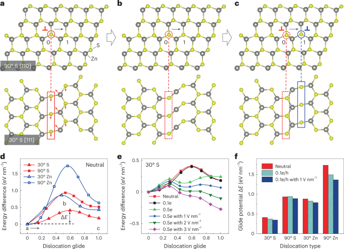 图4基于原子结构演化的位错滑动势垒;a – c, 30°S核心在滑动过程中的初始状态、过渡状态和最终状态示意图。圆形和矩形分别表示沿[110]和[111]轴观察的核心位置。位错核在初始状态时位于0位置,在最终状态时移动到1位置。黑色箭头表示位错的滑动方向。红色箭头表示位错核周围原子的运动方向。d,图4a-c所对应的初始状态、过渡状态和最终状态。箭头指示错位滑动的方向。初始状态的能量设置为参考,用虚线表示。滑动势垒ΔE是在位错线单位长度的滑动路径上,初始状态和过渡状态之间的能量差。e, 30°S不全位错在不同电荷态和不同电场作用下的MEPs。f,中性态(红色)、带电态(青色)和带电场的带电态(蓝色)四种部分位错的滑动势垒。©2023 Springer Nature