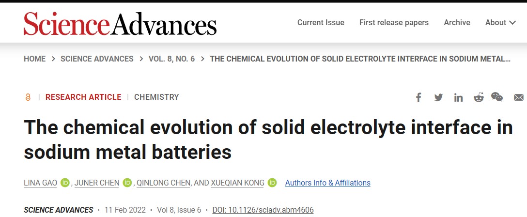 The chemical evolution of solid electrolyte interface in sodium metal batteries (Science Advances , DOI: 10.1126/sciadv.abm4606)