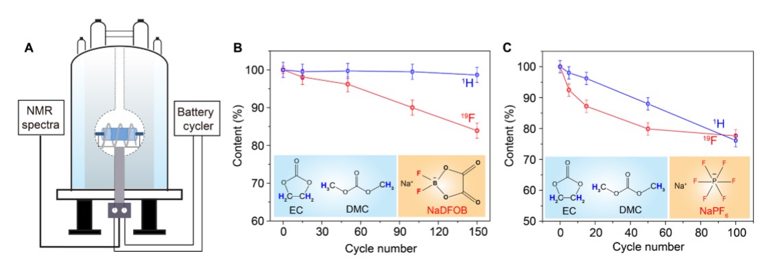2.研究了电极表面优异的SEI保护层如何延长电池寿命,SEI的化学结构如何随循环的进行发生演变,以及为什么特定的SEI组成对电池性能更有利。应用原位1H,19F和11B核磁共振谱量化了电池循环过程中电解液各组分的消耗。
