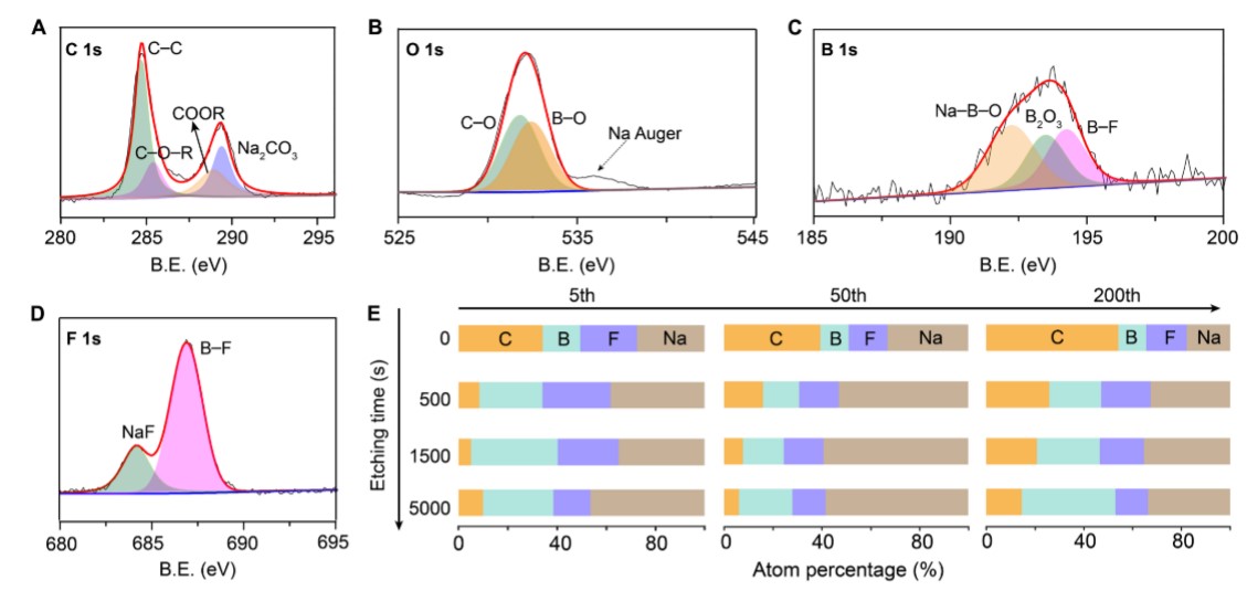 (e) 不同循环阶段的Na电极 (5th, 50th, 200th) 表面碳、硼、氟和钠原子含量随Ar离子刻蚀时间的变化