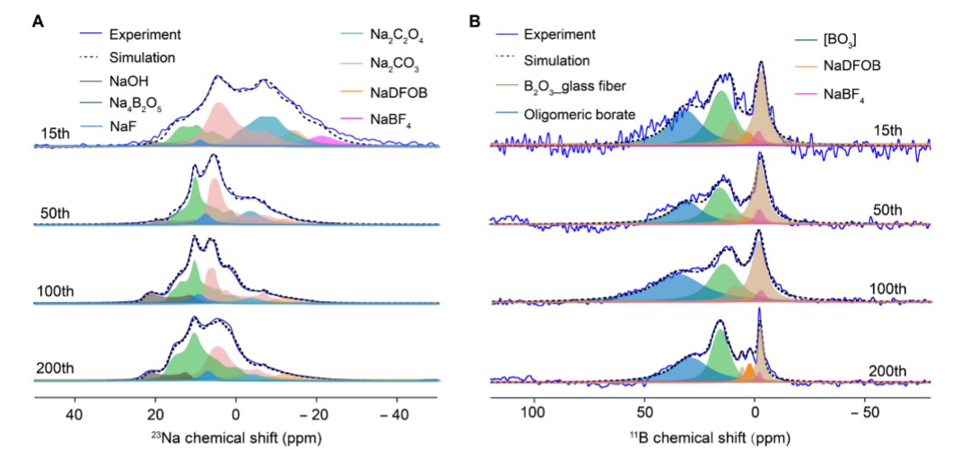 (b) 分别经过15,50,100和200个循环后的Na电极的11B一维固体NMR实验和拟合谱