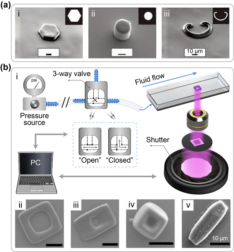 图1 | 连续流、间歇流光固化及微粒子制备。(a) 基于连续流光固化制备的二维拉伸的柱状微粒子。(b) 间歇流光固化制备工艺及两种光固化工艺制得的微粒子形态对比。