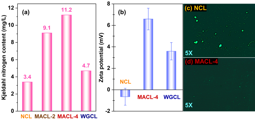 图2 (a)MA、WG处理对水中凯氏氮含量的影响;(b)MA、WG处理对泥料Zeta电位的影响;(c-d)MA处理前后泥料吸附蛋白的变化