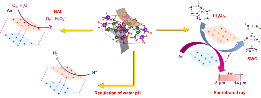 综上所述,通过MA和BM的协同作用,创造性地构建了由稳定的硅酸盐晶体组成的SPCE。MA处理有效地影响了粘土的结构,增加了离子的溶解和游离蛋白的释放。在BM过程中,离子以蛋白质为矿化模板和位点,通过自组装形成硅酸盐矿物前体。高温烧制后,硅酸盐前驱体脱水转化为六方晶体KCa3AlCa3Si4O16,在SPCE中具有优异的自极化性。SPCE的远红外发射率为0.951;SPCE可以激活空气中的H2O和O2形成NAI;SPCE可以激活和破坏大分子水簇中的分子间氢键,制备SWC;SPCE可将弱酸性水调节到pH接近中性。由于这些优异的生态效应,SPCE在水处理、空气净化及相关领域具有广阔的应用前景。