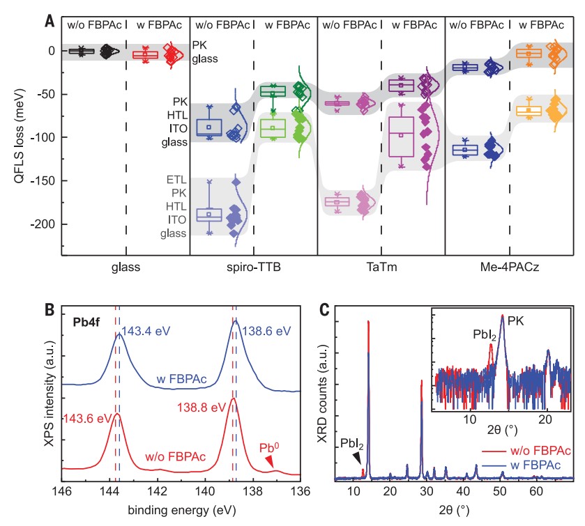 图1. 添加FBPAc时减少非辐射复合损失并改善晶体学性质(A)相对于玻璃/钙钛矿参考的光致发光量子产率数据提取的钙钛矿薄膜的光伏发光损失 (无和有FBPAc)。 空心菱形数据点对应于沉积在不同HTL(spiro-TTB、TaTm和Me-4PACz)上的钙钛矿薄膜的光伏发光损失,实心菱形与其中一个HTL和C60 ETL夹层的薄膜相关。 (B和C) Pb4f轨道的高分辨XPS光谱(B)和有无FBPAc的钙钛矿薄膜的XRD图案(C)。a.u.,任意单位。