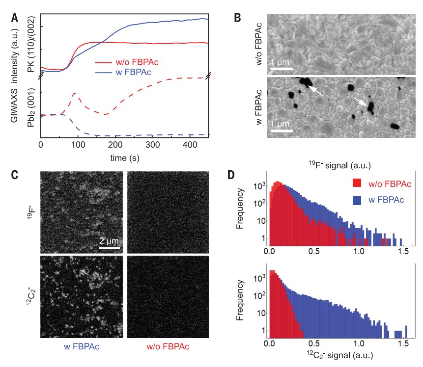 图2. FBPAc对钙钛矿结晶和形成的微观结构的影响。 (A) GIWAXS数据显示钙钛矿相(在图中表示为PK)的(110)和(002)平面以及在150℃的钙钛矿结晶过程中PbI2相的(001)平面的演变情况。 (B) 二次电子SEM图像突出显示了添加FBPAc时表面形态的差异,箭头表示FBPAc聚集体。 (C) 19F–和12C2–的SIMS图。亮色和暗色区域分别表示较高和较低的信号计数。 (D)与(C)中显示的19F–和12C2–SIMS信号相对应的直方图。
