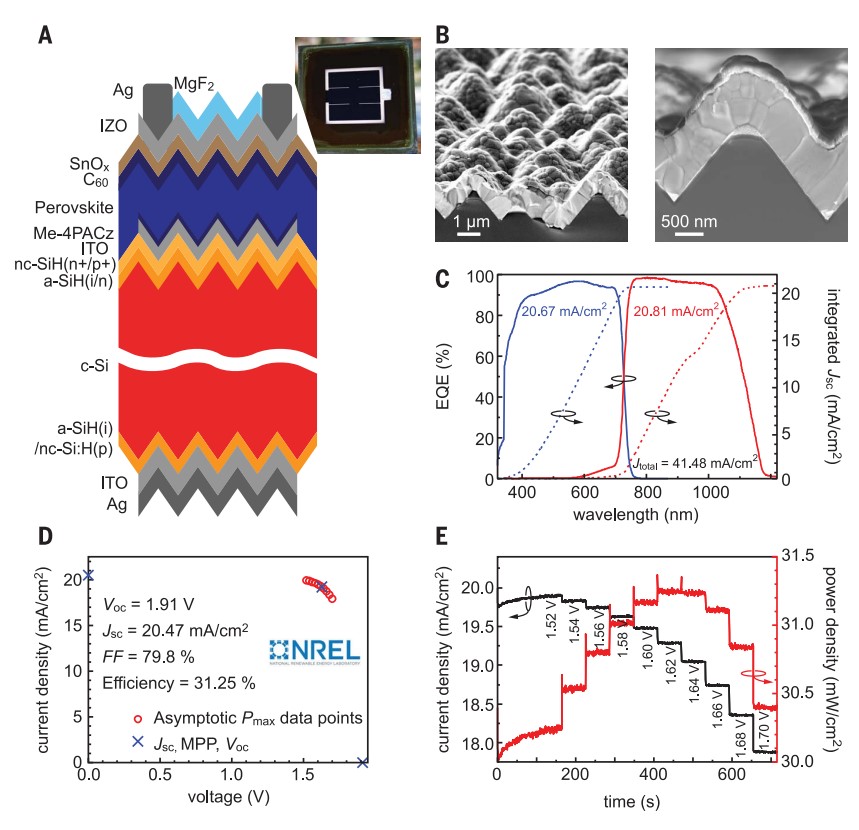 鉴于此,瑞士苏黎世联邦理工学院电磁场研究所Stefan M. Koepfli报道了一种零偏置的石墨烯光电探测器,其电光带宽超过500 GHz。硅太阳能电池接近其理论效率极限29%。通过先进的器件结构,可以超越这一限制,将两个或更多太阳能电池堆叠在一起,提高太阳能的收集效率。在这项工作中,我们设计了一种串联器件,将钙钛矿层覆盖在具有微米级金字塔纹理的硅底部电池上,以提高光电流。在处理序列中使用添加剂,调节钙钛矿的结晶过程,并减轻发生在钙钛矿顶部与电子选择性接触(富勒烯C60)之间的复合损失。我们展示了一个有效面积为1.17平方厘米的器件,实现了31.25%的认证功率转换效率。相关研究成果以“Interface passivation for 31.25%-efficient perovskite/silicon tandem solar cells”为题,发表在顶级期刊《Science》上。