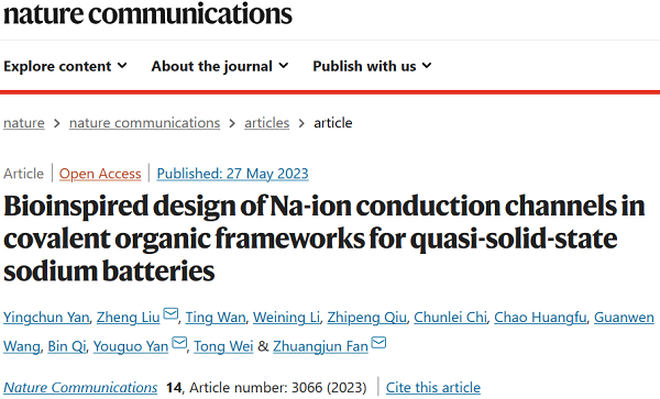 原文详情:Bioinspired design of Na-ion conduction channels in covalent organic frameworks for quasi-solid-state sodium batteries (Nat Commun 2023, 14, 3066)