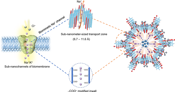 由相邻的-COO–基团和COF内壁构建的亚纳米级Na+输运区的仿生概念图示。
