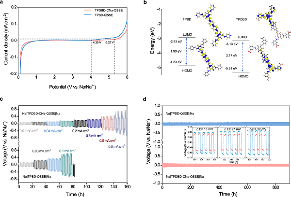 (a)SS|TPBD-QSSE|Na和SS|TPDBD-CNa-QSSE|Na不对称电池的LSV图。