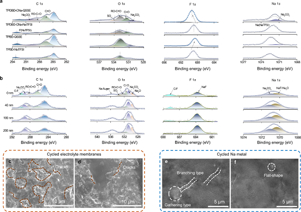 (a)TPDBD-CNa-QSSE/TPBD-QSSE在Na||Na电池中0.02 mA cm-2和25 ± 1 °C下超过20个循环以及TPDBD-CNa-NaTFSI/TPBD-NaTFSI的C 1s、O 1s、F 1s和Na 1s的XPS图像。
