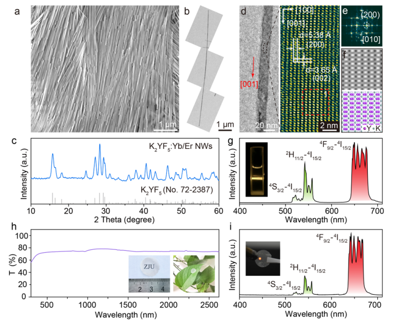 图1.K2YF5:Yb/Er上转换纳米线的晶体结构与光学性质。(a)K2YF5:Yb/Er纳米线的低倍扫描电子显微镜(SEM)图像。(b)单根超长纳米线的低倍透射电子显微镜(TEM)图像。(c)K2YF5:Yb/Er纳米线X射线衍射(XRD)谱图。(d)单根K2YF5:Yb/Er纳米线的低倍TEM图像(左)和高分辨率—低剂量TEM(HRTEM)图像(右)。(e)d图中选定区域的对应快速傅里叶变换(FFT)图像。(f)d图中选定区域的衬度转换函数(CTF)—校正去噪图像,顶部和底部分别为K2YF5的模拟投影电位图和结构模型。(g)环己烷溶液中的K2YF5:Yb/Er纳米线在980 nm激发(50 W/cm2)下的上转换发射光谱。插图:溶液的发光照片。(h)自立式K2YF5:Yb/Er薄膜的透射光谱。插图:薄膜的实物照片。(i)自立式K2YF5:Yb/Er薄膜在980 nm激发(1.50 W/cm2)下的上转换发射光谱。插图:薄膜的发光照片。