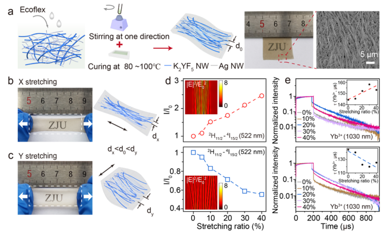 图3.纳米线有序排列的UCNW/Ag NWs/Ecoflex柔性薄膜的光学特性。(a)纳米线有序排列的UCNW/Ag NWs/Ecoflex薄膜的制备过程示意图、实物照片及SEM图像,其中沿一个方向搅拌后薄膜中的纳米线有序排列。柔性薄膜沿两个垂直方向(b)X轴和(c)Y轴拉伸的示意图及高拉伸性。(d)980 nm激发(50 W/cm2)下,薄膜中Er3+在522 nm处发射强度与拉伸应变的关系。插图:不同距离银纳米线的模拟电场分布。(e)980 nm激发(100.0 W/cm2)下,沿X轴(顶部)和Y轴(底部)两个垂直方向不同程度拉伸薄膜时样品在1030 nm处的Yb3+动态曲线。