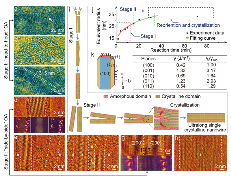 图2. 基于逐步定向附着(POA)制备超长单晶上转换纳米线的机理研究。K2YF5:Yb/Er纳米晶体在290°C条件下不同反应时间对应的低倍TEM图像:(a)0分钟,(b)4.0分钟,(c)7.0分钟。K2YF5:Yb/Er纳米晶体在290°C条件下不同反应时间对应的高分辨率—低剂量TEM图像:(d)7.0分钟,(e)17.0分钟,(f)20.0分钟,(g)45.0分钟,(h)240.0分钟。其中符号 i 和 ii 分别表示结晶区域和非晶区域。d图底部带有蓝色框的图像分别为K2YF5:Yb/Er纳米线晶体部分(中)、非晶部分(右)及叠加后(左)的伪色图,g图底部带有绿色框的图像分别为K2YF5:Yb/Er纳米线晶体部分(中)、非晶部分(右)及叠加后(左)的伪色图。(i)超长K2YF5:Yb/Er纳米线的生长过程示意图。(j)基于定向附着机制的纳米晶体尺寸与反应时间的实验数据和拟合结果。(k)根据表面能计算拟合的K2YF5:Yb/Er纳米晶的平衡形状。