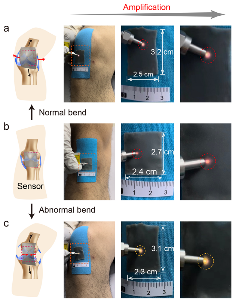 图4. 纳米线有序排列的UCNW/Ag NWs/Ecoflex柔性薄膜作为光学方向传感器的应用。将纳米线有序排列的UCNW/Ag NWs/Ecoflex柔性薄膜贴在膝关节上,对不同状态的膝关节有不同光学响应。在 980 nm激发下,(a)正常膝关节弯曲、(b)膝关节直立和(c)受伤膝关节异常弯曲时的示意图及对应发光照片。