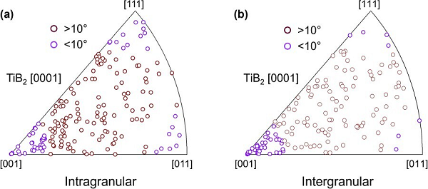 平行于晶内和晶间分布的TiB2颗粒的[0001]方向的Al基体取向的反极图。
