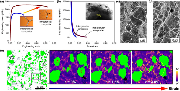 通过SLM在金属复合材料中引入晶内分散结构来实现将GBs和强化物引起的应力集中解耦,得到的TiB2-Al复合材料的抗拉强度提高了30%,延展性提高了近三倍。