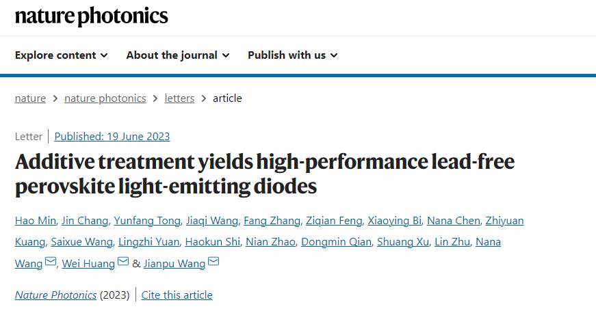 原文详情:Hao Min, Jin Chang, Yunfang Tong, Jiaqi Wang, Fang Zhang, Ziqian Feng, Xiaoying Bi, Nana Chen, Zhiyuan Kuang, Saixue Wang, Lingzhi Yuan, Haokun Shi, Nian Zhao, Dongmin Qian, Shuang Xu, Lin Zhu, Nana Wang, Wei Huang & Jianpu Wang.Additive treatment yields high-performance lead-free perovskite light-emitting diodes, Nature Photonics, 2023.