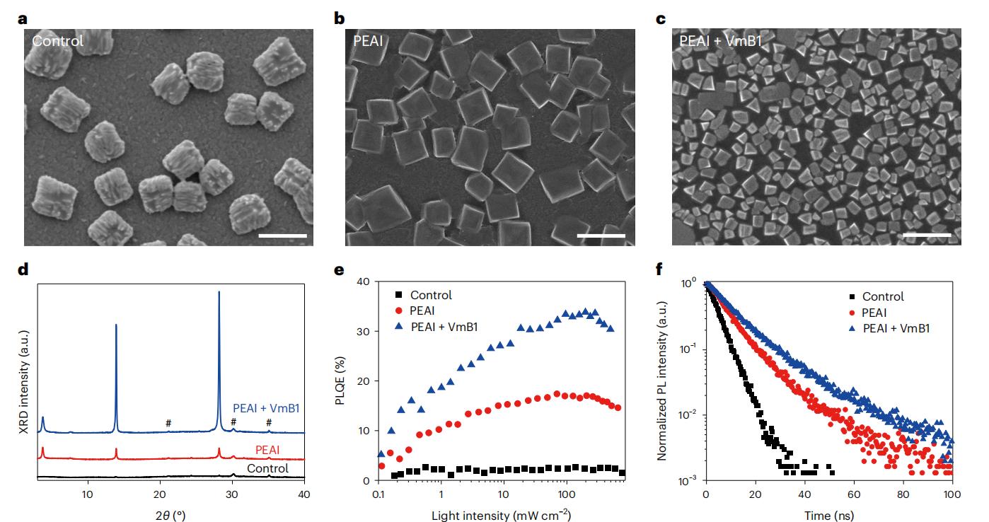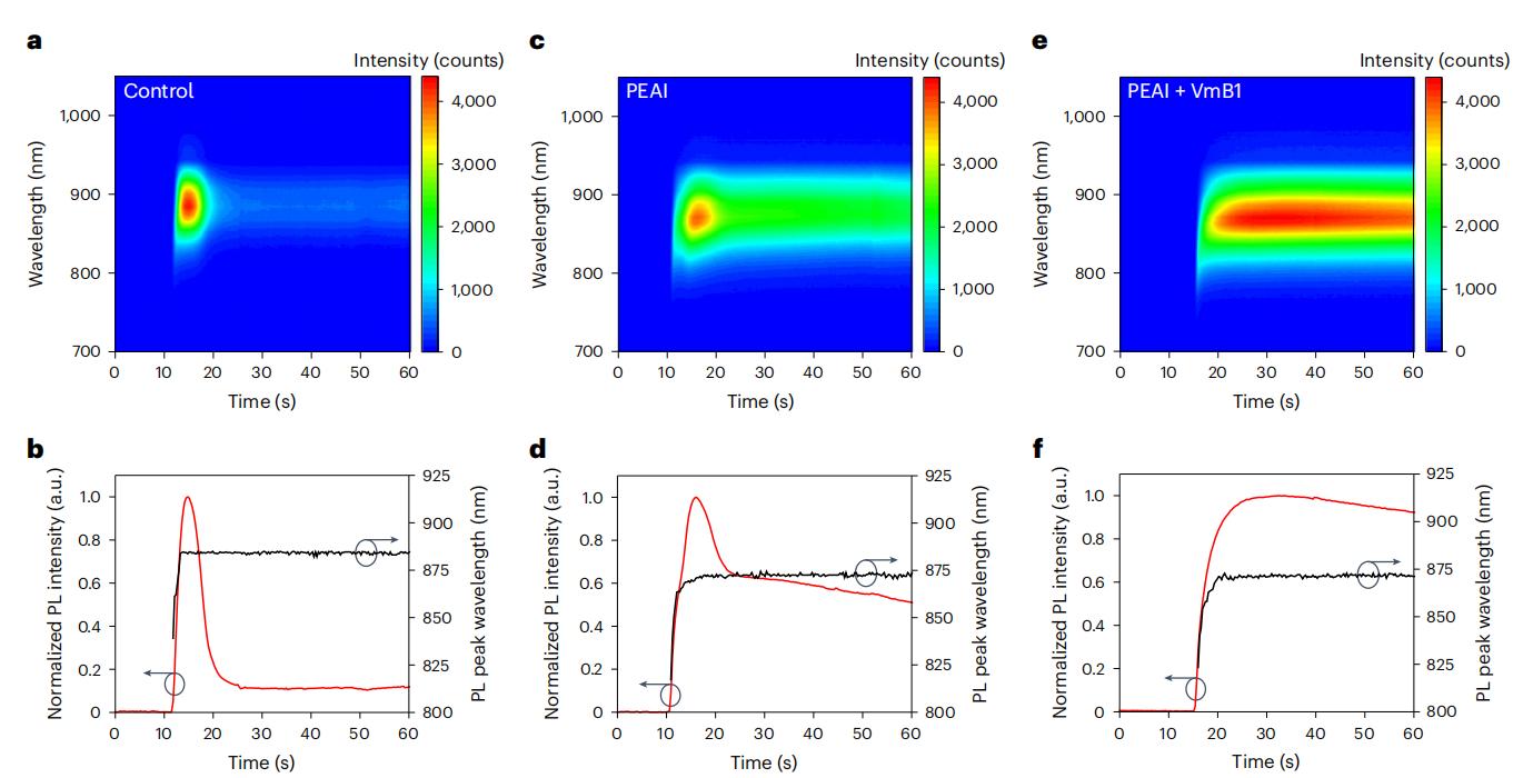 近日,南京工业大学黄维院士、王娜娜教授和王建浦教授团队在Nature Photonics上发表了新的研究论文,通过在锡基钙钛矿前驱体中加入适当的添加剂,可以抑制发光猝灭,从而获得高量子效率的发光二极管。在本项研究中,作者首先通过原位光谱手段探明了锡基钙钛矿发光淬灭的主要原因是锡基钙钛矿成膜过程中钙钛矿纳米团簇的快速团聚所伴随产生的大量缺陷所致。为解决这一问题,作者在锡基钙钛矿前驱体中加入了能够与SnI2形成强化学键的添加剂(苯乙胺氢碘酸盐,PEAI,维生素 B1,VmB1)从而实现了对锡基钙钛矿薄膜生长的调控,制备出了形貌规则、结晶良好的具有低缺陷密度的锡基钙钛矿薄膜。该低密度薄膜的最高发光量子效率可达34%(激发功率密度:~200 mW/cm2),平均发光量子效率为29±3%。基于此低密度钙钛矿薄膜制备的冠军红外发光二极管(发射峰894 nm)的外量子效率达到8.3%,平均外量子效率为6.5%,证明了该种方法良好的重复性。相关研究文章以“Additive treatment yields high-performance lead-free perovskite light-emitting diodes”为题发表在Nature Photonics上。