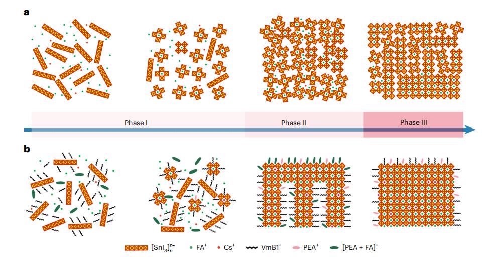 图3. 在不添加和添加PEAI-VmB1时FA0.9Cs0.1SnI3薄膜生长示意图。©2023 Springer Nature