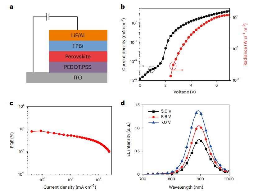 图4. 在PEAI和添加比例为0.15的VmB1共同添加时所获得的FA0.9Cs0.1SnI3钙钛矿发光二极管的性能表征。©2023 Springer Nature