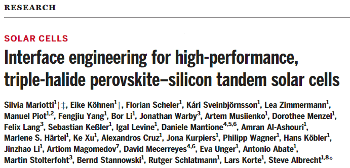 德国柏林工业大学的Steve Albrecht团队,证明了双端子单片钙钛矿-硅串联太阳能电池的改进的稳定性和效率,需要减少复合损耗。通过将三卤化物钙钛矿(1.68 eV带隙)与哌嗪碘化物界面改性相结合,改进了能带对准,降低了非辐射复合损失,并增强了在电子选择性接触处的电荷提取。特定的钙钛矿组成(3 Hal)和PI浓度(0.3mg ml-1)下,PI的主要作用不是钙钛矿表面的化学钝化,而是允许导带(CB)和最低未占据分子轨道之间的偏移显著降低(约350 mV)。因此,电子的准费米能级可以移动得更靠近钙钛矿CB边缘。此外,从电荷分离的角度来看,表面光电压测量显示在PI的存在下,在钙钛矿表面的电子选择性增加,这与已报道的PI在钙钛矿表面上的工作机制不同。太阳能电池在p-i-n单结中显示出高达1.28V的开路电压,在钙钛矿-硅串联太阳能电池中显示出高达2.00 V的开路电压。串联电池实现了高达32.5%的认证功率转换效率。该项工作以标题为:“Interface engineering for high-performance, triple-halide perovskite–silicon tandem solar cells”发表在Science上。