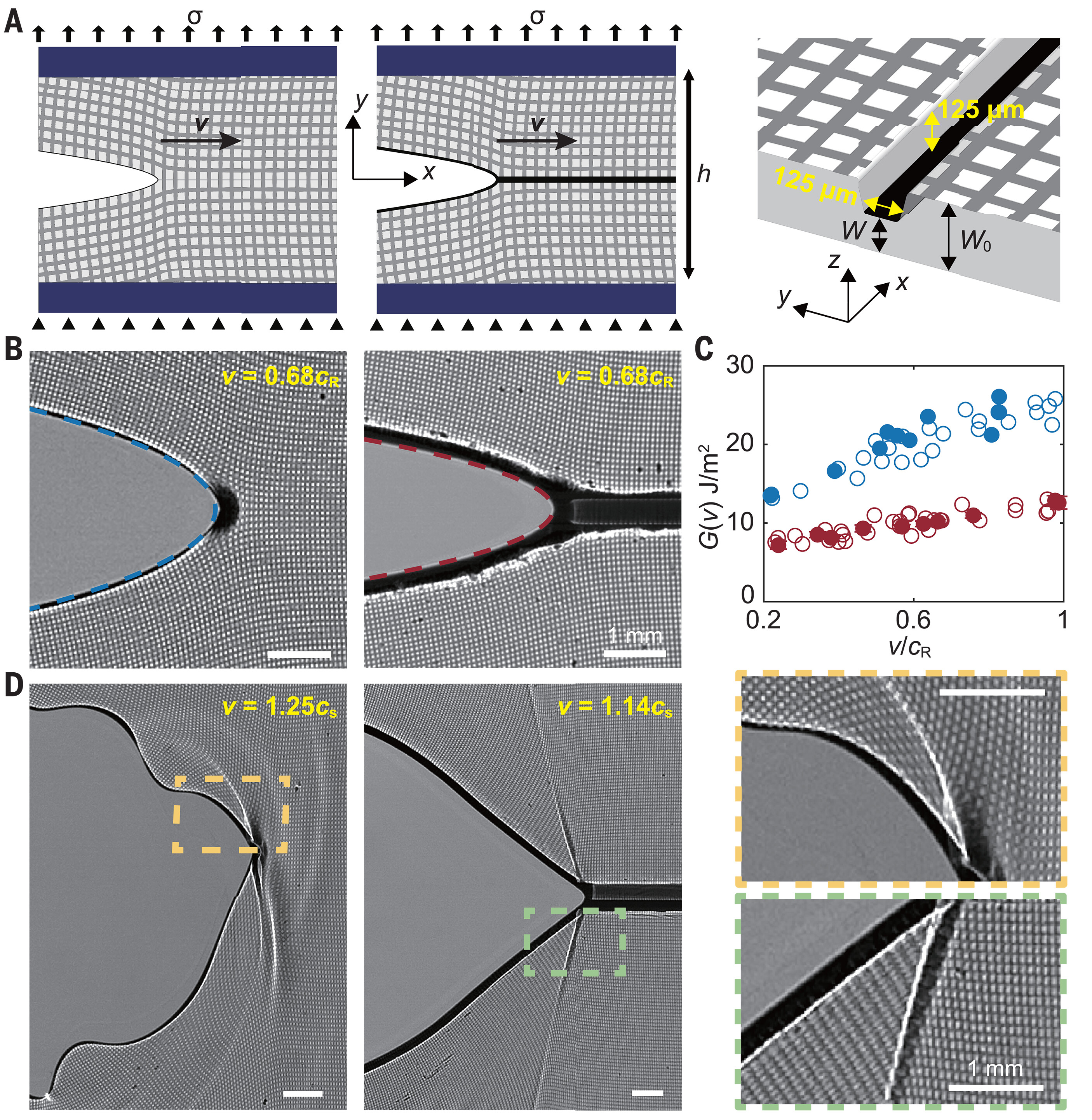 材料如何断裂?裂纹扩展的速度有多快?这是材料科学和工程学中的一个重要问题,因为它直接影响材料的强度、韧性和可靠性。在张力作用下,材料中的应力在接近裂纹尖端的体积中被放大,当势能超过材料的断裂能时,裂纹将向断裂传播。一般认为,移动裂纹的最大速度不能超过瑞利波速cR。在裂纹尖端附近,远程施加的应力被放大到近似奇点。裂纹运动受能量平衡原理指导:从大尺度(系统尺寸)流向裂纹尖端的存储势能通量与材料的断裂能相平衡时,就会发生断裂。在保持能量平衡的同时,裂纹速度(v)会平稳加速到cR。超过cR时,断裂力学预测进入裂纹尖端的能量通量将变为负值,从而使v>cR不符合实际情况。这一速度限制的例外情况可能发生在由剪切荷载驱动的裂纹中。具有有限尺寸耗散区的裂纹的分析解预示着正能量流入“超剪切”裂纹,其速度介于剪切波速度和扩张波速度之间。通常认为由拉伸载荷驱动的裂纹受cR的限制。该极限以及线性弹性断裂力学预测的相应运动方程已通过实验得到证实。将经典断裂扩展到超弹性材料预测拉伸裂纹可能会超过cR。然而,仍然缺乏明确的实验证据和对超剪切拉伸断裂的基本理解。