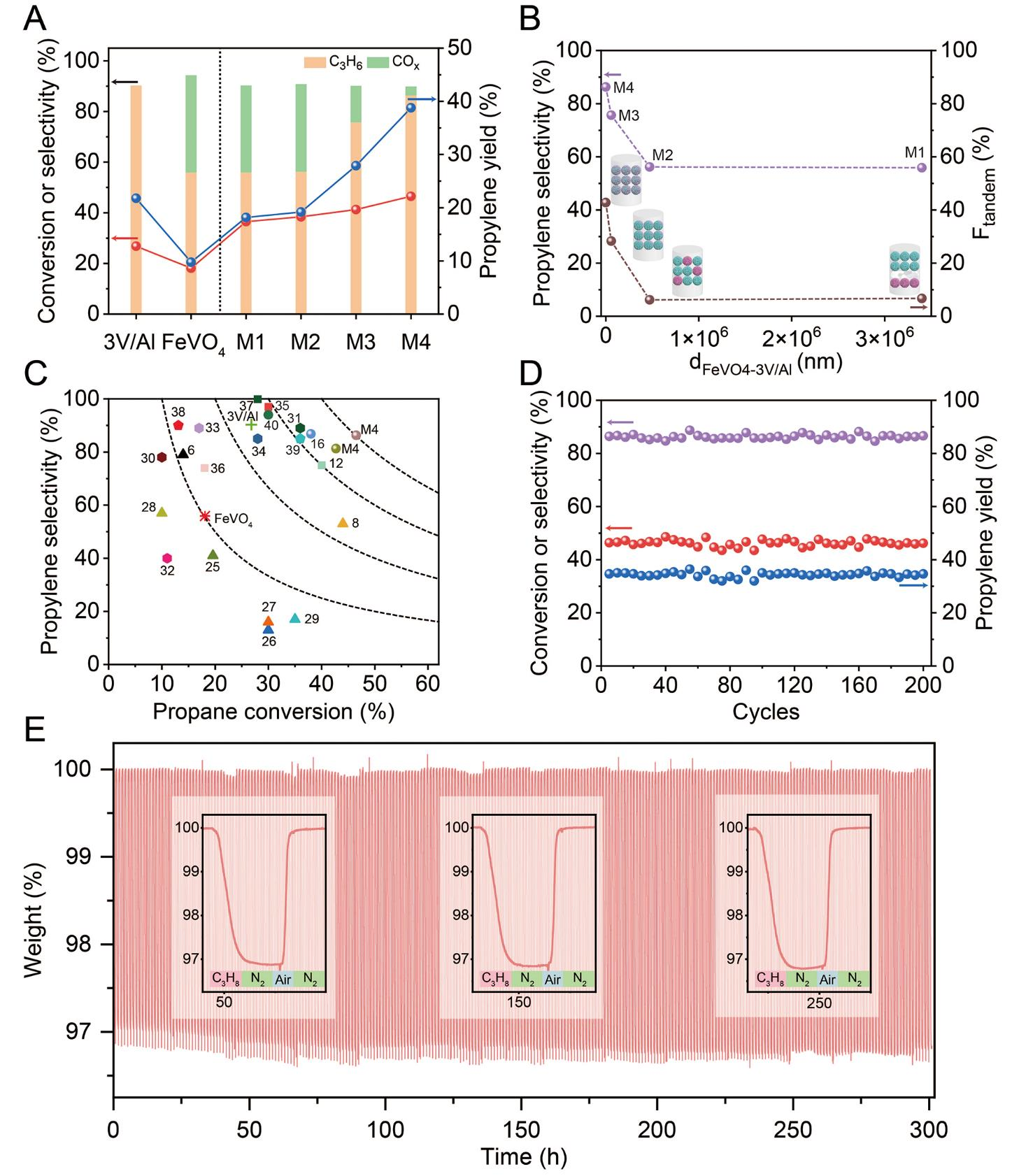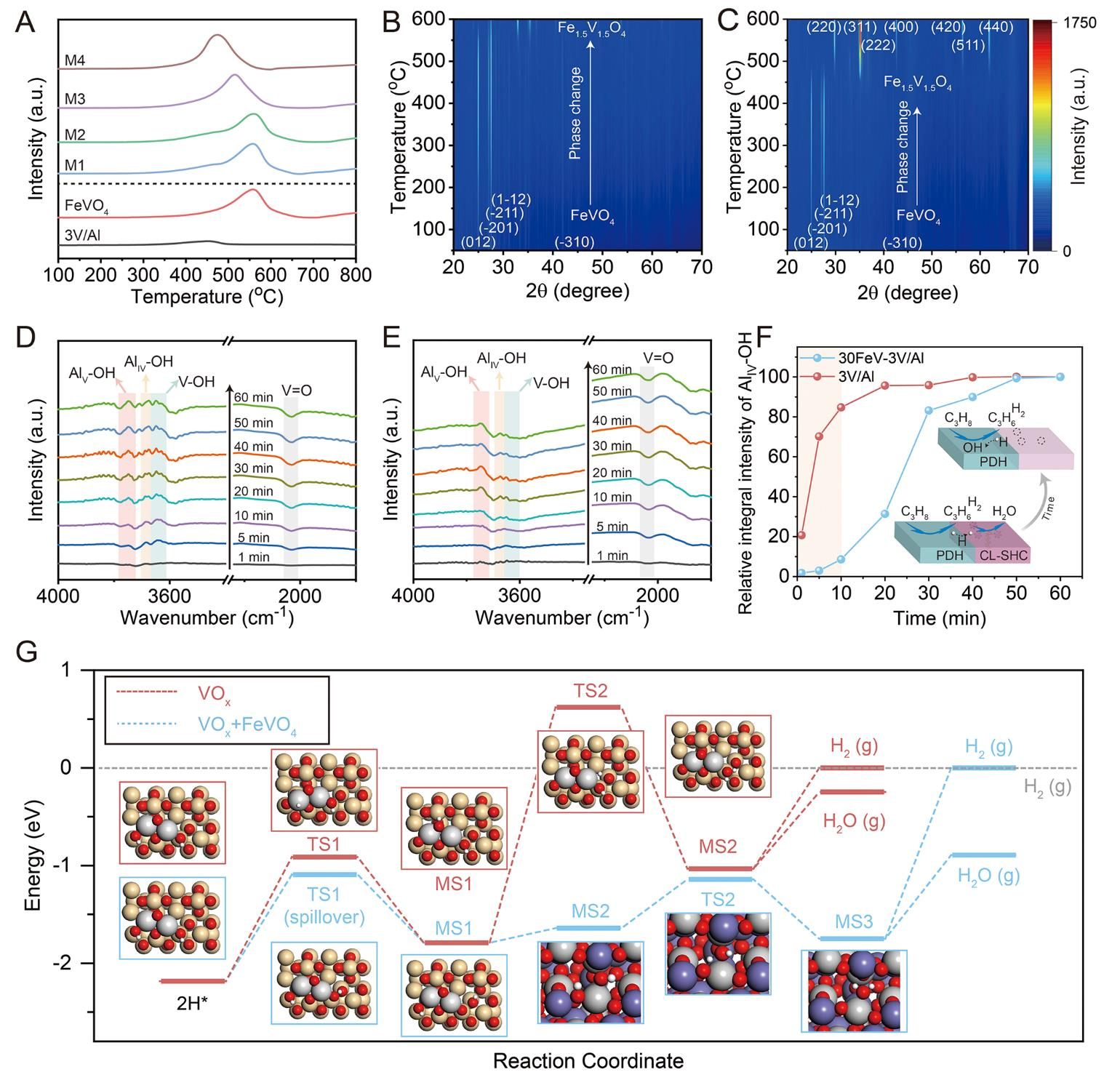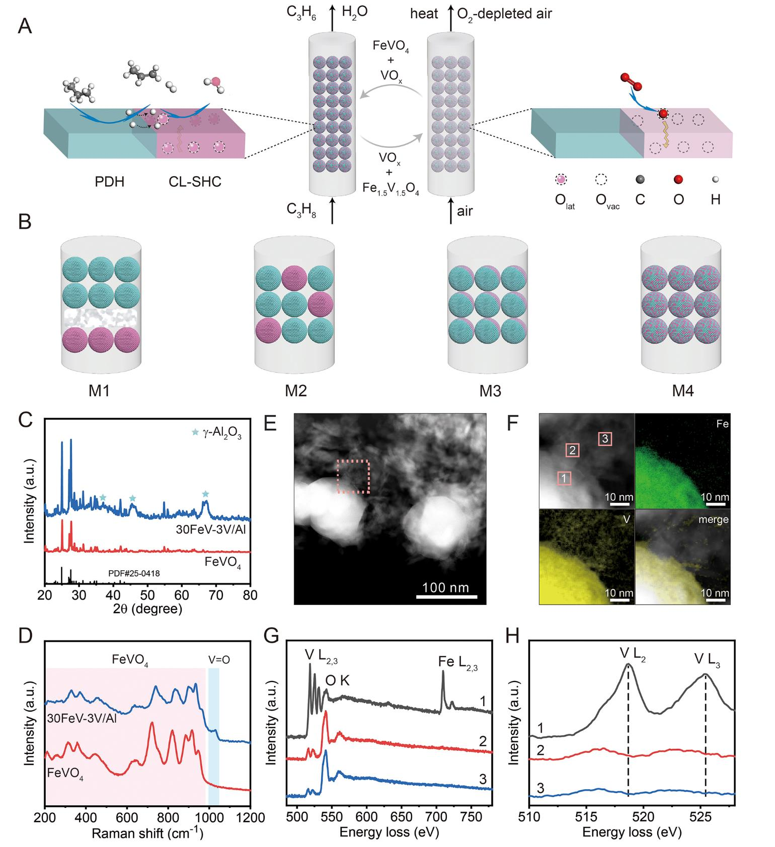 天津大学巩金龙教授等人将化学链选择性H2燃烧和PDH与多功能FeVO4-VOx氧化还原催化剂相结合。均匀分散在Al2O3上的VOx提供了脱氢反应位点,而相邻的纳米级FeVO4则作为氧载体进行随后的H2燃烧。基于催化实验、光谱表征和理论计算,提出了一种通过氢溢出介导的耦合机制。在VOx位点生成的氢中间体会迁移到相邻的FeVO4位点进行燃烧,从而促使PDH向丙烯转化。相关的研究成果以“Tandem propane dehydrogenation and surface oxidation catalysts for selective propylene synthesis”发表在Science上。