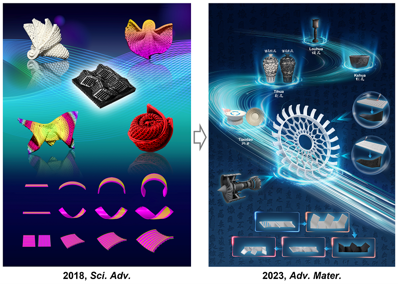 2018年8月,香港城市大学吕坚院士研究组全球首创陶瓷4D打印技术(Guo Liu, Yan Zhao, Ge Wu, Jian Lu. Origami and 4D printing of elastomer-derived ceramic structures, Science Advances. 4, 8, eaat0641, 2018),该技术结合了3D打印,自变形组装,和弹性体衍生陶瓷(Elastomer-derived ceramics,EDCs),在大尺寸陶瓷结构的形状复杂程度,机械强度,制造成本,和适应复杂环境能力上实现了突破。该工作被欧盟委员会列为《面向未来的100项颠覆性技术创新》中4D打印案例之一,其中100项颠覆性技术绝大部分由欧美团队领先,该研究成果为4D打印技术入选的4个案例中唯一中国具有自主知识产权的工作(P. Warnke et al., 100 Radical Innovaation Breakthroughs for the future, 2019)。该工作获颁国家工业和信息化部的科学技术成果登记证书(登记号:3392019Y0014),其评价报告指出“该技术拥有自主知识产权,陶瓷‘4D’打印概念属国际首创,相关技术具有创新性和超前性,有重要的学术和技术价值”。该工作被《人民日报》(头版)、《参考消息》、New Scientist、美联社等国内外知名媒体广泛报道,入选“2019未来HTH官网地址 智能制造十大事件”。