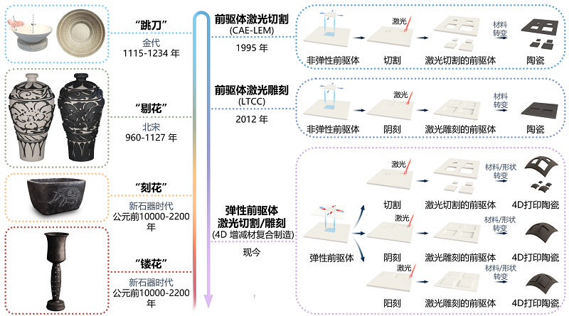 受中国传统陶艺启发,利用陶瓷前驱体材料的易加工性,集成了陶瓷4D打印系统与减材制造、异质工程、表面工程等技术,提出了4D增减材复合制造陶瓷的新概念。