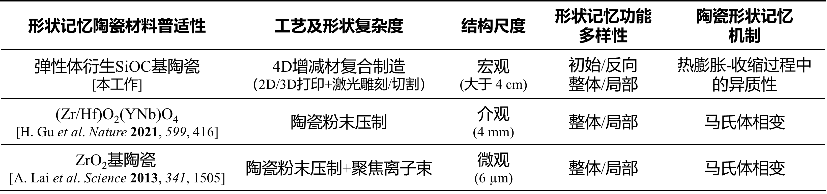 陶瓷等高温结构材料的发展因其极高的熔点和构建复杂结构的难度而受到限制。弹性体衍生陶瓷的四维 (4D) 打印在陶瓷的几何灵活性上取得突破。然而,陶瓷 4D 打印系统的应用受限于耗时繁琐的形状转变(变形)和材料转变(变质)独立分步的工艺过程、低精度的4D变形机制/3D结构特征/2D表面质量、及低热性能的SiOC基陶瓷。此外,现有4D打印技术制备的陶瓷材料的形状不能发生变化,而现有形状记忆陶瓷的研究受限于低材料普适性、低几何灵活性、小结构尺寸、及低形状记忆功能灵活性。