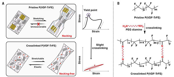 在此,中国科学院宁波材料技术与工程研究所李润伟研究员与胡本林研究员(共同通讯作者)报告了一种基于PVDF的通过部分交联实现的固有弹性铁电体,这是一种通过共价键连接两条聚合物链的过程。该聚合物即使在较大的机械变形下也表现出稳定的铁电性,适用于需要弹性的应用。