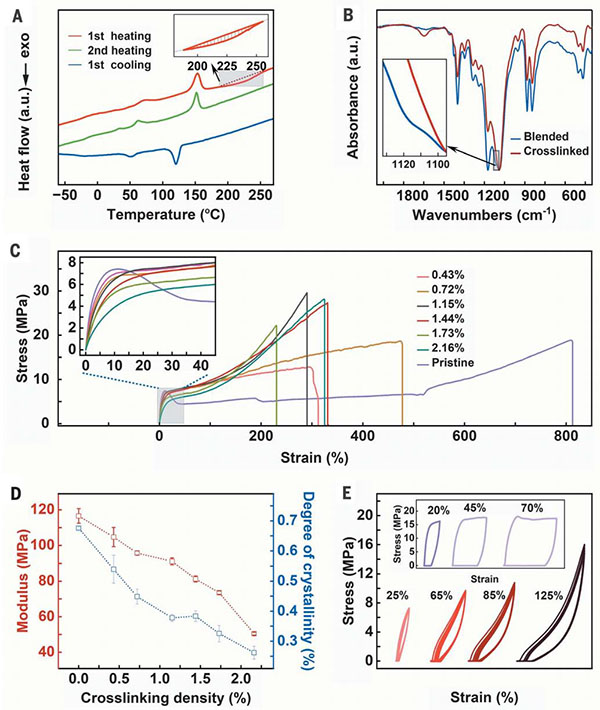 作者发现,交联密度优化值为1.44%时,化学改性后逇P(VDF-TrFE)能够表现出最佳的结晶度和弹性。此外,得益于PVDF和PEG二胺的不混溶联性主要发生在半结晶聚合物的非晶区域,这从一定程度上保留了结晶区域中的β相,并解释了观察到的铁电性。结果显示,本文提出的化学改性可以将塑性铁电聚合物“调控”为弹性体,实现从不可逆变到可逆变形的转变。