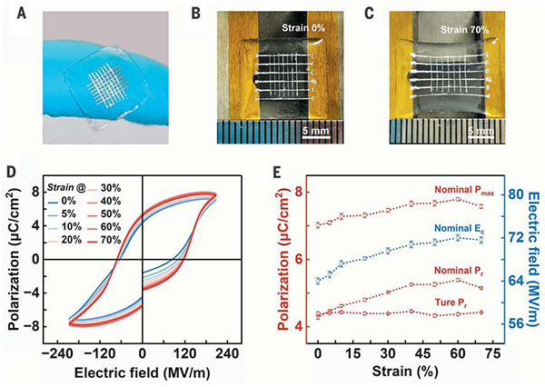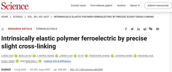 相关研究成果以“Intrinsically elastic polymer ferroelectric by precise slight cross-linking”为题发表在Science上。
