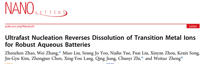 相关研究成果以“Ultrafast Nucleation Reverses Dissolution of Transition Metal Ions for Robust Aqueous Batteries”为题发表在国际著名期刊Nano Letters上。