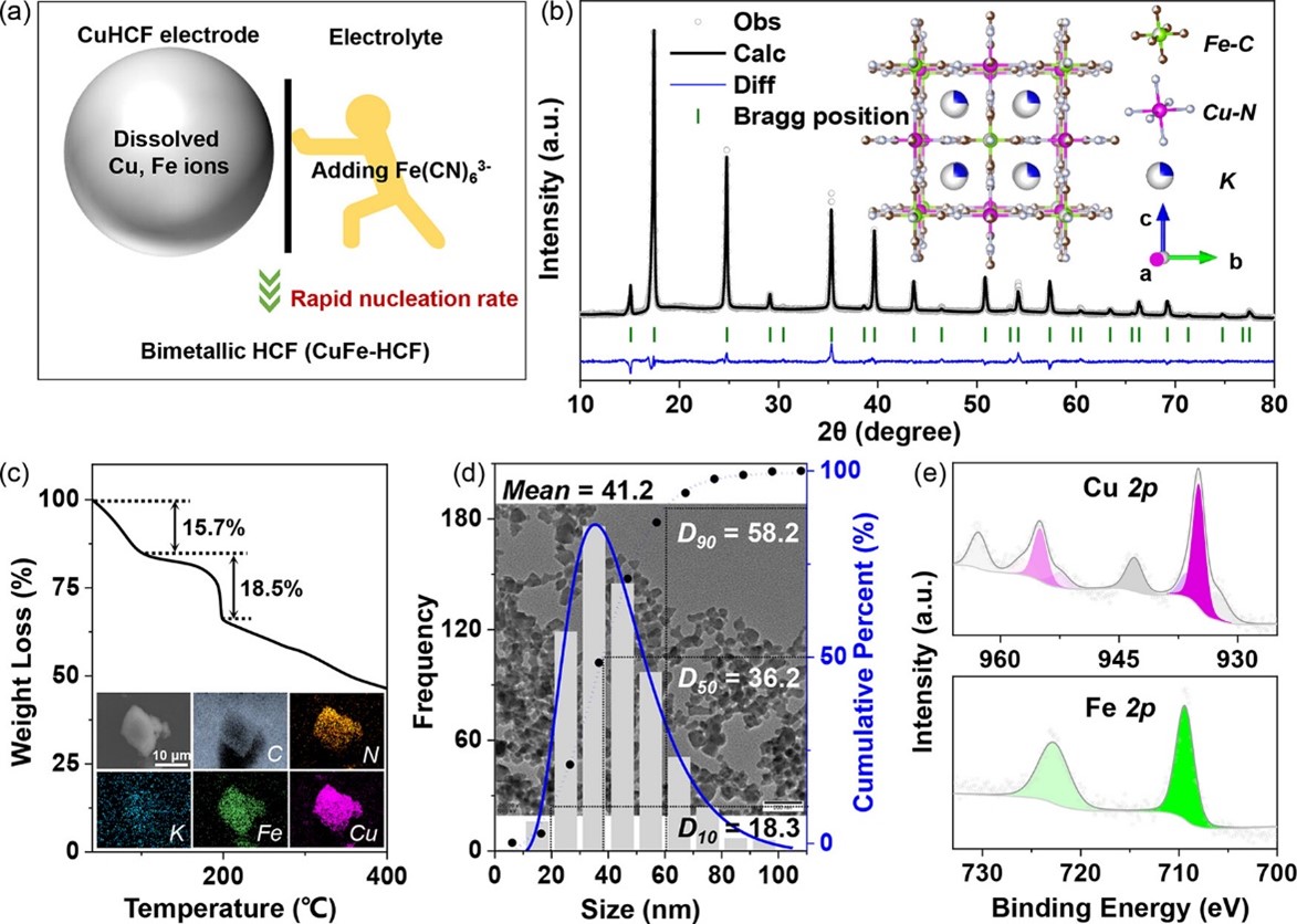 图1 CuHCF的结构表征。(a)抑制金属离子溶解示意图,(b) XRD精修及对应晶体结构图,(c) TGA (SEM-EDS元素映射插图),(d) TEM及相应粒度分布(左),累积数分布(右),以及对应的不同粉体颗粒直径D值,(e) Fe和Cu 2p的XPS光谱;Copyright © 2023 American Chemical Society.