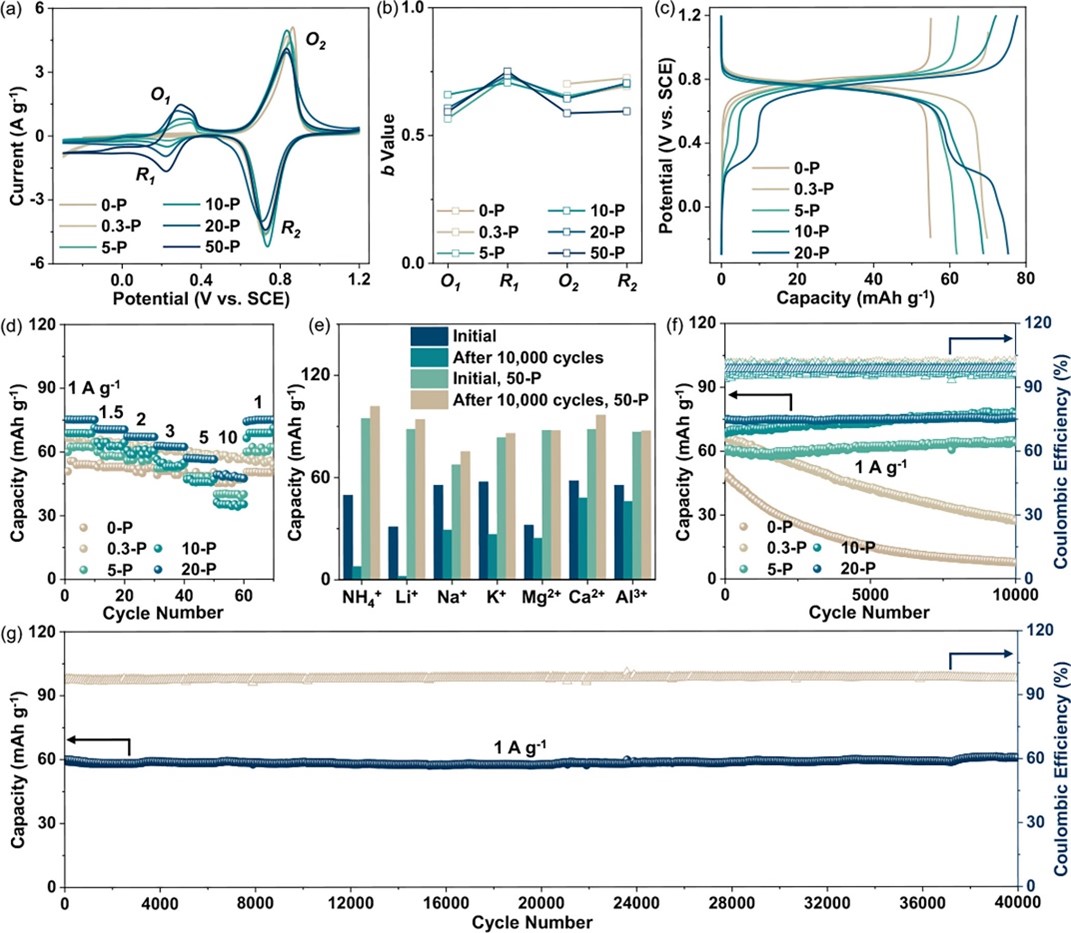 图2 电化学性能。(a) CV曲线,(b) b值,(c) GCD曲线,(d)倍率,(e)不同工作离子的电化学性能图,(f)循环性能,(g)长期稳定性图; Copyright © 2023 American Chemical Society.
