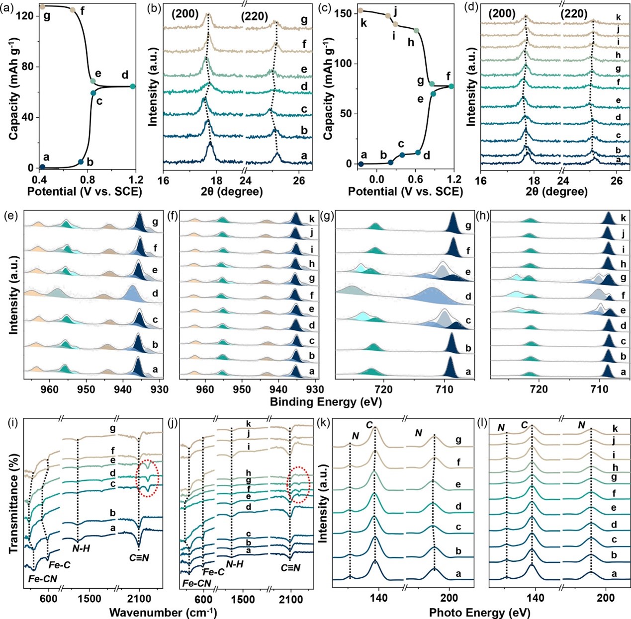 图3 初始条件(0-P)和优化条件(20-P)下NH4+的电化学存储机理。(a) 0-P的GCD曲线,(b) 0-P的ex-XRD曲线,(c) 20-P的GCD曲线,(d) 20-P的ex-XRD曲线,(e) 0-P的Cu 2p的ex-XPS,(f) 20-P的Cu 2p的ex-XPS,(g) 0-P的Fe 2p的ex-XPS,(h) 20-P的Fe 2p的ex-XPS,(i) 0-P的ex-FTIR,(j) 20-P的ex-FTIR,(k) 0-P的ex-SXES,(l) 20-P的ex-SXES;Copyright © 2023 American Chemical Society.