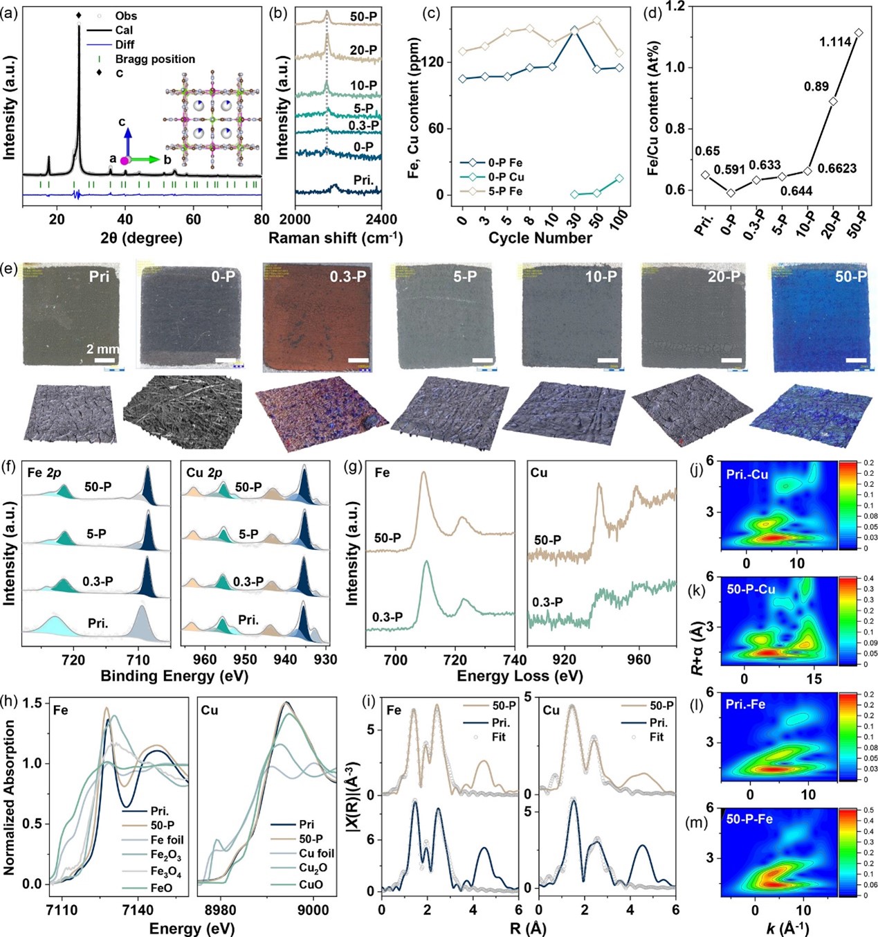 图4 CuHCF的稳定性测试后电化学储能机制探究。(a) XRD谱图的Rietveld分析及其晶体结构图,(b)拉曼光谱,(c) 0-P和5-P的不同循环圈数的电解液的ICP,(d)稳定性测试后电极片的ICP,(e) LSCM图像,(f) Fe 2p和Cu 2p的XPS,(g) Fe和Cu的EELS,(h) XANES,(i) EXAFS,(j−m)相应的CCWT;Copyright © 2023 American Chemical Society.