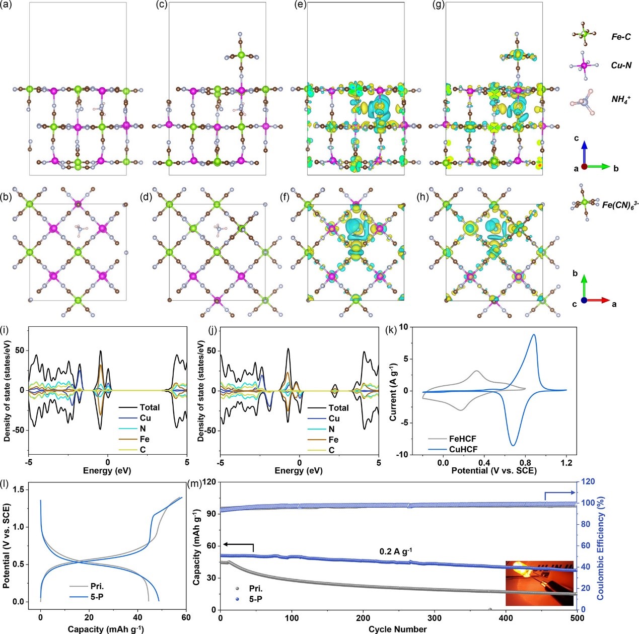 图5 CuHCF的计算和全电池性能图。NH4+在(a, b)原始和(c, d) 50-P中的吸附位置;(e, f)原始和(g, h) 50-P的差分电荷密度图(黄色和青色区域分别代表富电子和贫电子区域);(i)原始和(j) 50-P的DOS图;(k)CuHCF和FeHCF的CV曲线;全电池的(l)GCD曲线,(m)循环性能图(LED供电插入);Copyright © 2023 American Chemical Society.