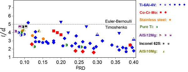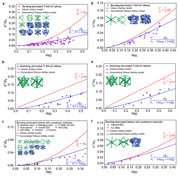 图2:传统Gibson-Ashby模型(红色曲线)和拓展Gibson-Ashby模型对各种3D打印超材料力学性能的适用性比较