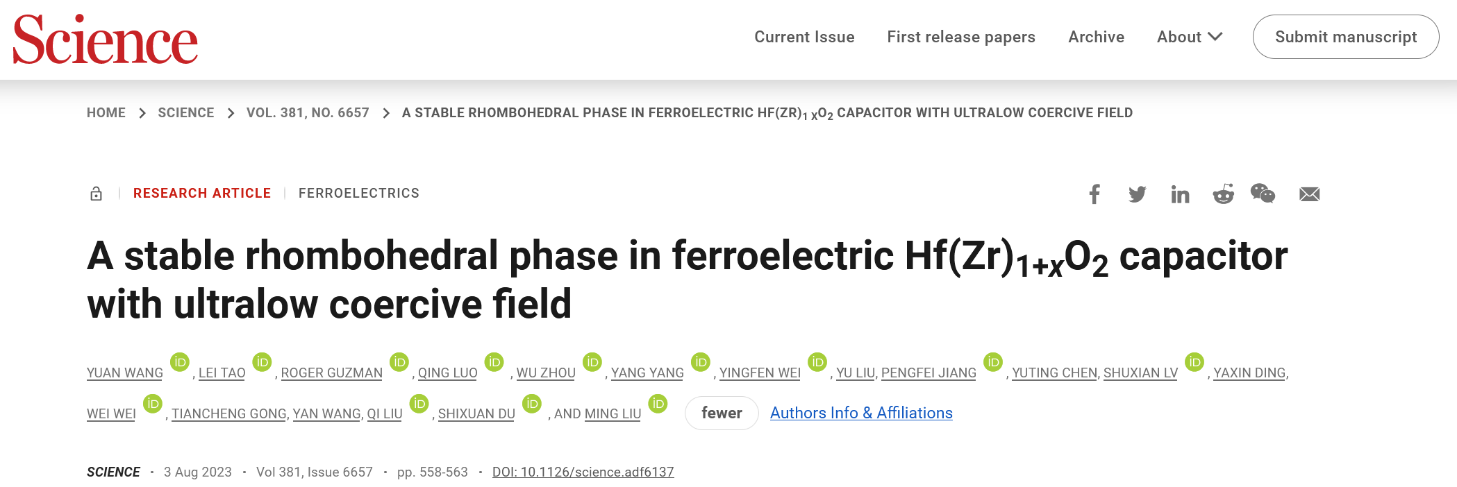 近日,中国科学院微电子研究所刘明院士、罗庆研究员以及中科院物理研究所杜世萱研究员带领团队发现了一种新型菱面体铁电材料r-Hf(Zr)1+xO2,通过Hf(Zr)1+xO2薄膜的特殊结构和插层作用,成功降低了矫顽场,提高了器件的性能和可靠性,Hf(Zr)1+xO2铁电薄膜的发现为低成本和长寿命的存储芯片提供了新的制造方法和思路。相关的研究成果以“A stable rhombohedral phase in ferroelectric Hf(Zr)1+xO2 capacitor with ultralow coercive field”为题发表在science上。