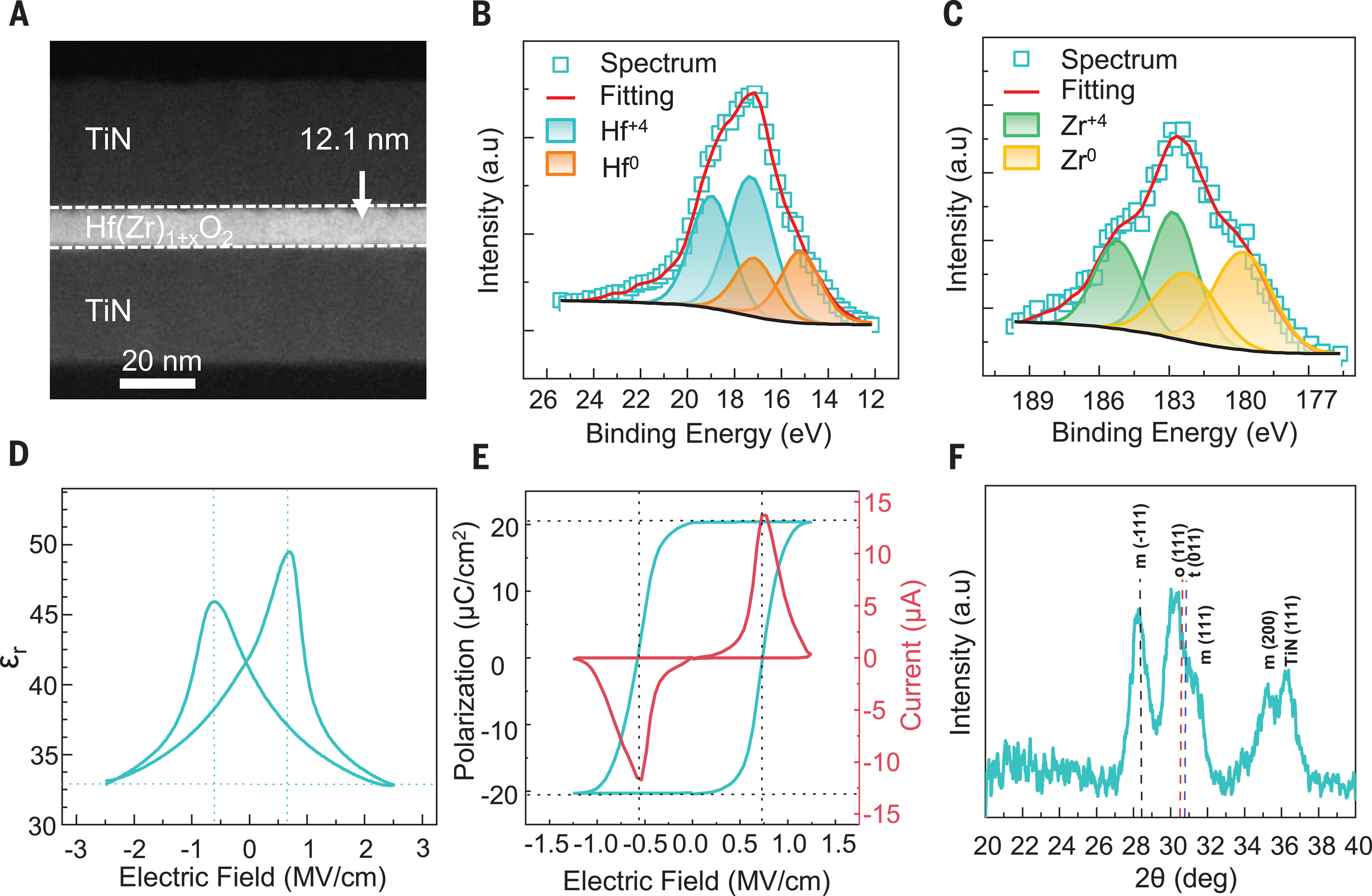 图1 平面金属-铁电-金属(MFM)电容器及Hf(Zr)1+xO2薄膜的结构表征。 ©2023 AAAS