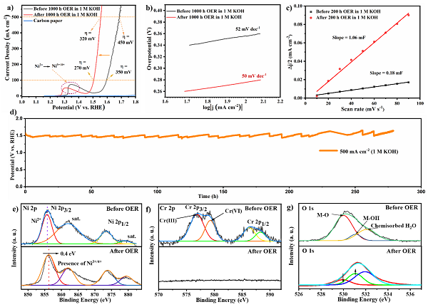 NixCryO的OER活性在1 M KOH中随着时间的推移而提高:在10 mA cm-2恒电流下进行1000小时稳定性测试后,过电势反而有所下降。