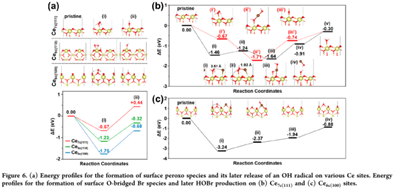 为了进一步阐明背后的反应机制,利用EPR捕获自由基实验、H2O2的分解实验、原位Raman实验,结合DFT计算,从原子视角探究了不同Ce位点与H2O2的相互作用。结果显示,CeO2立方体上的Ce6c(100)位点通过自由基路径催化H2O2分解,其速率高于棒状上的Ce6c(110)位点。而八面体上的Ce7c(111)位点即使吸附了H2O2也无法进行这种氧化还原反应,导致了微弱的POD-like和CAT-like活性。但当反应溶液中加入KBr后,八面体Ce7c(111)位点上吸附的H2O2快速分解,结合其极高的HPO-like活性,我们可以推断出BrOH的生成是通过peroxo路径而不是自由基路径。八面体Ce7c(111)和立方体Ce6c(100)表现出完全不同的H2O2激活路径,是由于它们的还原性和H2O2吸附构型截然不同。然而,中等还原性的棒状Ce6c(110)能够生成双配位基或单配位基的peroxo物种,同时具有两种H2O2激活路径,因此在POD-like/CAT-like和HPO-like反应中均表现出中等的活性。